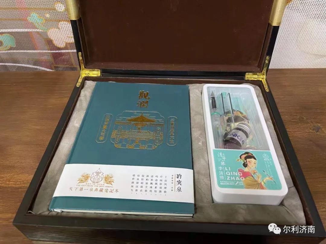 錄制結(jié)束后,主辦方還為王珮瑜特別準備了一份禮物—天下第一泉文創(chuàng)設(shè)計的城市伴手禮。這份伴手禮是由一支李清照題材的文創(chuàng)鋼筆、兩本以天下第一泉的“觀瀾”、“源清流潔”御題石碑為題材的筆記本組成。禮盒使用了高端畫絹手繪趵突泉的腰封,內(nèi)襯也采用了濟南傳統(tǒng)技藝制作的泉水扎染。這份禮物體現(xiàn)了濟南的歷史傳承、泉水文化和“二安文化”。